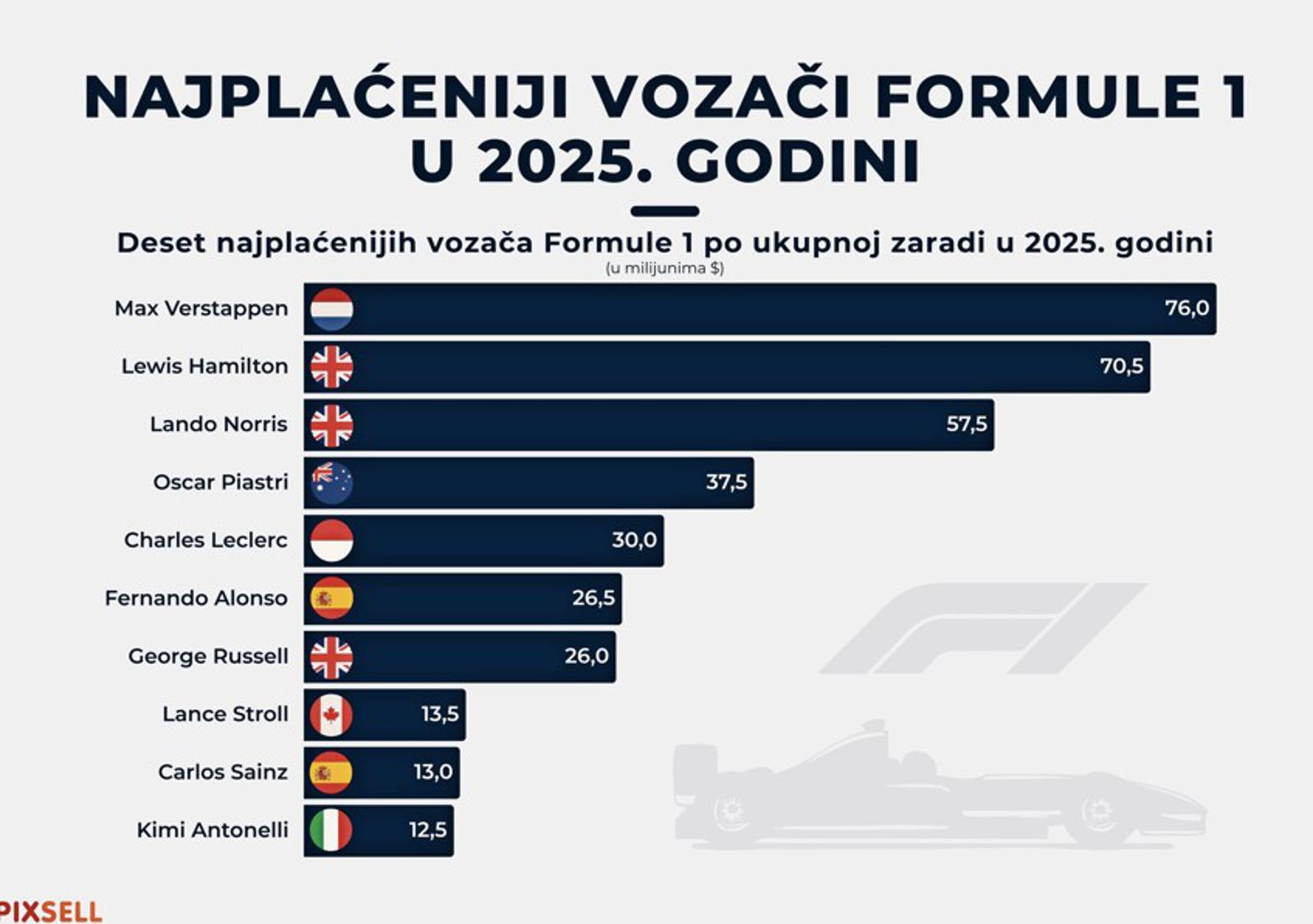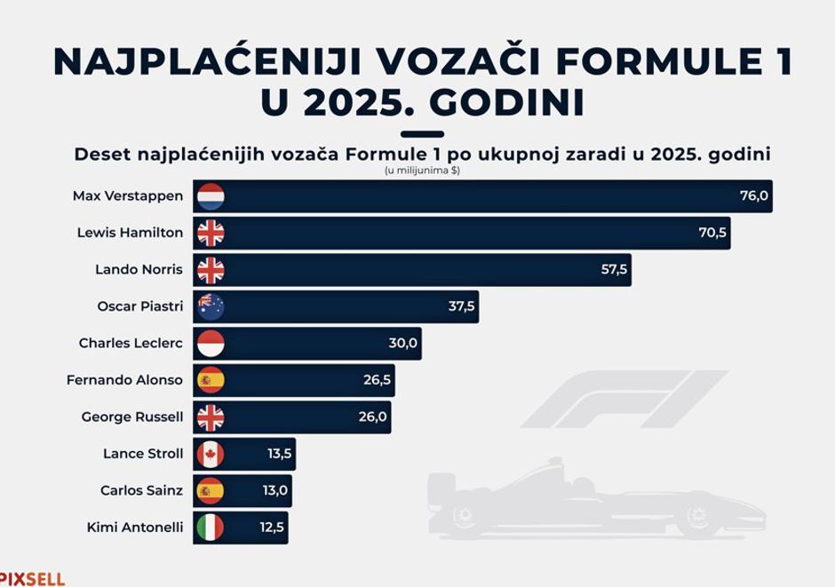 Na vrhu ljestvice nalazi se Max Verstappen sa 76 milijuna dolara, ispred Lewisa Hamiltona sa 70,5 milijuna i Landa Norrisa s 57,5 milijuna. U sredini su Oscar Piastri, Charles Leclerc, Fernando Alonso i George Russell, dok listu zaključuju Lance Stroll, Carlos Sainz i mladi Kimi Antonelli, svi s bitno manjim, ali i dalje impresivnim iznosima. Infografika jasno naglašava koliko su velika financijska odstupanja među zvijezdama vrha poretka i ostatka grida.