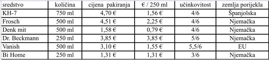 Na (gotovo) svima kočoperi se natpis da učinkovito uklanjaju i najtvrdokornije mrlje. Masnoća, krv, ulje, čokolada, umaci, voće, izmet, dječja hrana, šminka, trava, mrlje na ovratnicima i manžetama – a sve to skida bez izbjeljivača! Navodi se to na jednom od šest sredstava koje smo kupili u svrhu testiranja. Uz napomenu: 'Zaista djeluje!' Zaista? Kako bismo testrirali učinkovitost tih šest sredstava – KH-7, Frosch, Denk mit, Dr. Beckmann, Vanish i Bi Home – razrezali smo jednu staru pamučnu plahtu na 36 komada te ih isprljali sa šest stvari uobičajenih u kućanstvu, kako bi se svako sredstvo zasebno borilo protiv kemijske olovke, kave, cikle, crnog vina, vodootporne maskare i ruža za usne. Svaki smo komad tkanine nastojali zaprljati podjednako, a potom smo ih ostavili da prije tretiranja sredstvom za čišćenje odstoje tri sata. Na to smo se odlučili iako na sredstvima piše da mrlju treba odmah tretirati zbog toga što se većina nezgodnih situacija dogodi onda kad nismo u prilici mrlju odmah 'napasti' sredstvom za čišćenje, bilo to u restoranu ili školi, na izletu ili na putovanju. Dakle, čišćenju mrlja pristupili smo tri sata nakon što su mrlje nastale. Princip je kod svih isti: valja nanijeti na mrlju, ostaviti do 10 minuta, istrljati i oprati na uobičajeni način. Pritom paziti da ne dođe u dodir s očima ili da ga ne dohvate djeca. Evo rezultata.