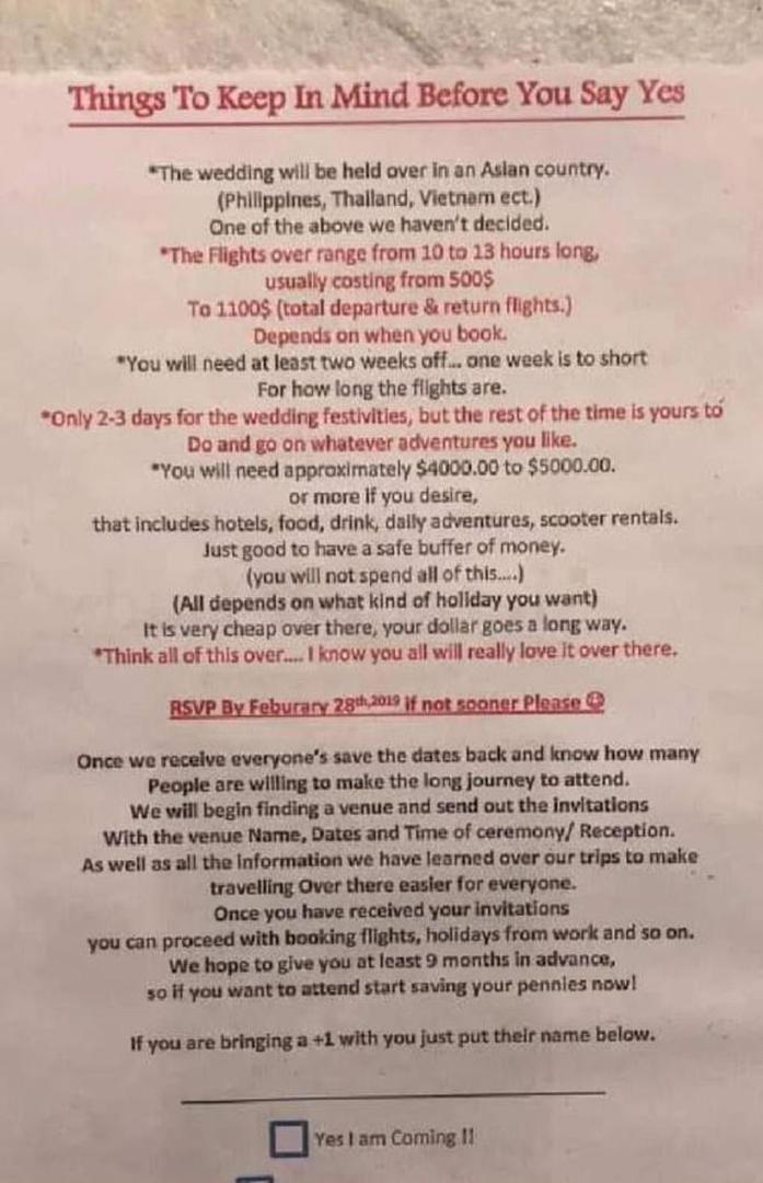 Nemogući zahtjevi od gostiju traže da uzmu barem dva tjedna godišnjeg odmora, iako vjenčanje traje tri dana. Pozivnica je došla na dvije stranice, a mladenka je navela tri zemlje gdje bi se svadba mogla održati, s obzirom na to da se još uvijek nije odlučila za lokaciju.