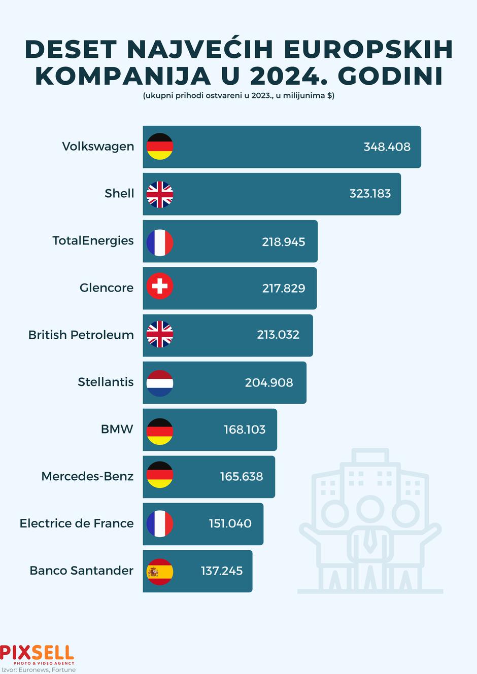 U 2024. godini najveće europske kompanije predvodi Volkswagen s prihodom od 348,4 milijarde dolara ostvarenim u 2023. godini. Njemački automobilski div uspješno drži prvu poziciju zahvaljujući snažnoj prodaji i investicijama u električna vozila. Na drugom mjestu je energetski gigant Shell, dok treće mjesto zauzima Total Energies, još jedna naftna kompanija koja dominira europskim tržištem energenata. U prvih deset nalaze se i British Petroleum (BP), kao i njemački proizvođači automobila BMW i Mercedes-Benz, koji također ostvaruju značajan prihod od elektrifikacije i inovacija u automobilskoj industriji.