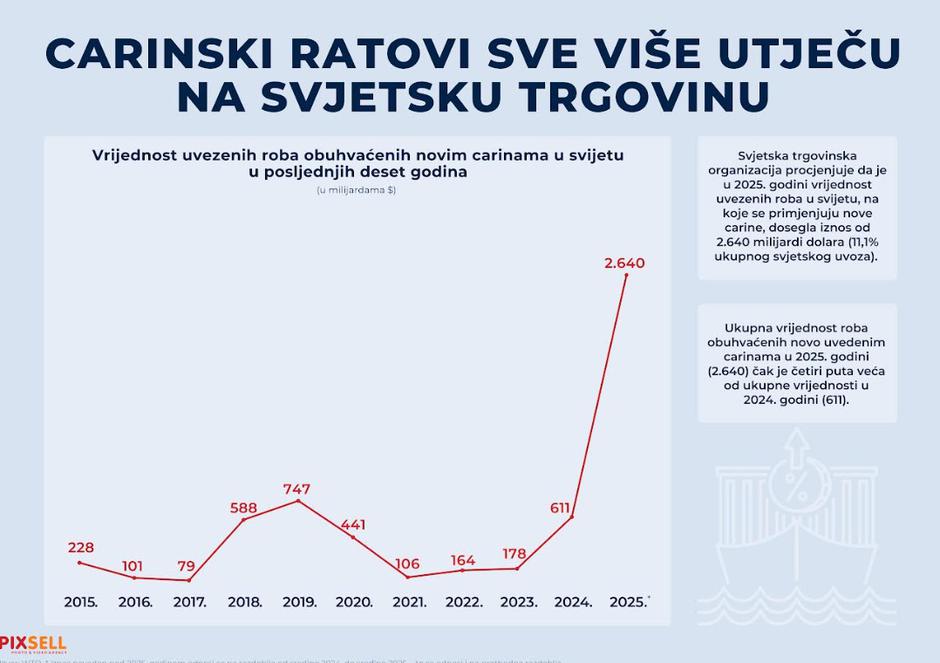Infografika prikazuje kako su carinski ratovi posljednjih godina sve snažnije pogodili svjetsku trgovinu. Linijski graf prikazuje vrijednost uvezene robe obuhvaćene novim carinama od 2015. do 2025. godine u milijardama dolara, pri čemu se iznos u 2025. naglo penje na 2,640 milijardi. Tekst ističe da to čini oko 11,1% ukupnog svjetskog uvoza te da je vrijednost u 2025. čak četiri puta veća nego 2024. godine, kada je iznosila 611 milijardi dolara.