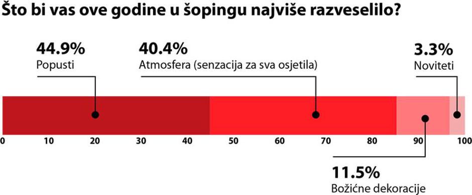 Zašto su Hrvati raspoloženi za shopping u vrijeme blagdana? Jer je upravo njihov omiljeni shopping centar mjesto na kojem mogu osjetiti blagdansku atmosferu i pronaći inspiraciju. Iako nas je na prvu iznenadilo da više ispitanika pronalazi blagdansku inspiraciju u shopping centru nego na Instagramu, brzo smo shvatili da se i sami prepoznajemo u njima. Vidjeti raskošne dekoracije i izloge uživo, pjevušiti božićne pjesme dok tražimo poklone za najdraže, osjetiti uzbuđenje svih oko nas – ni najljepše fotografije na Instagramu ne mogu se mjeriti s osjećajima koje u nama budi atmosfera u shopping centru tijekom blagdanskog razdoblja. Za čak 40,4% ispitanika upravo je ta posebna atmosfera ono što bi ih i ove godine najviše razveselilo u shoppingu. Veće veselje od toga može donijeti samo jedna stvar – dobri popusti, naravno!