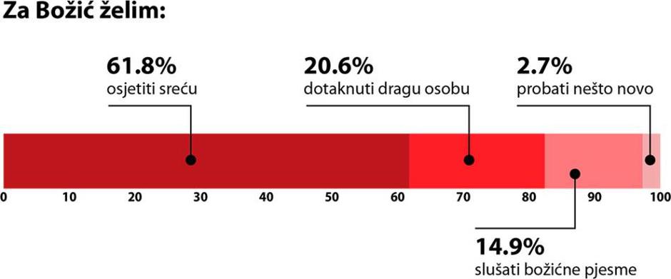 61,8% ispitanika za ovaj Božić želi osjetiti sreću, 20,6% dokatnuti dragu osobu, 14,9% želi uživati u slušanju božićnih pjesama, a 2,7% želi isprobati nešto novo što će se pretvoriti u dragocijenu uspomenu ili možda čak novu božićnu tradiciju!