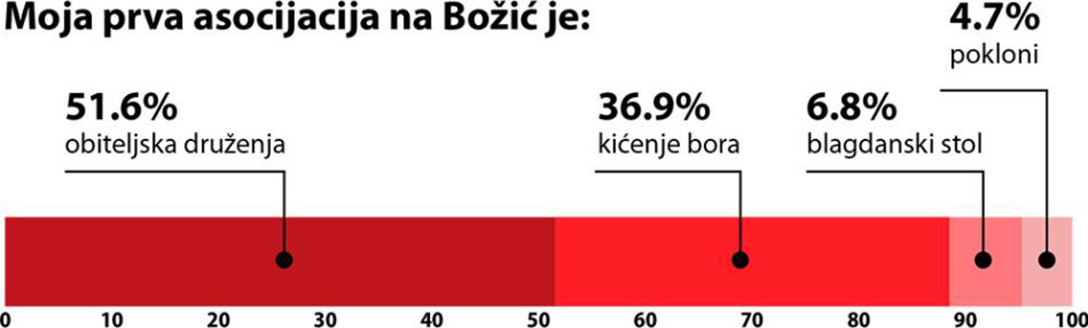 Što su otkrili? Neki će vas odgovori možda iznenaditi, neki oduševiti, a neki čak i raznježiti, baš poput odgovora na naše prvo pitanje koje je bilo koja je vaša prva asocijacija na Božić. Za čak 51,6% ispitanika prva asocijacija na Božić su obiteljska druženja, a 36,9% ispitanika to je kićenje bora, dok su za ostatak to blagdanski stol i pokloni.
