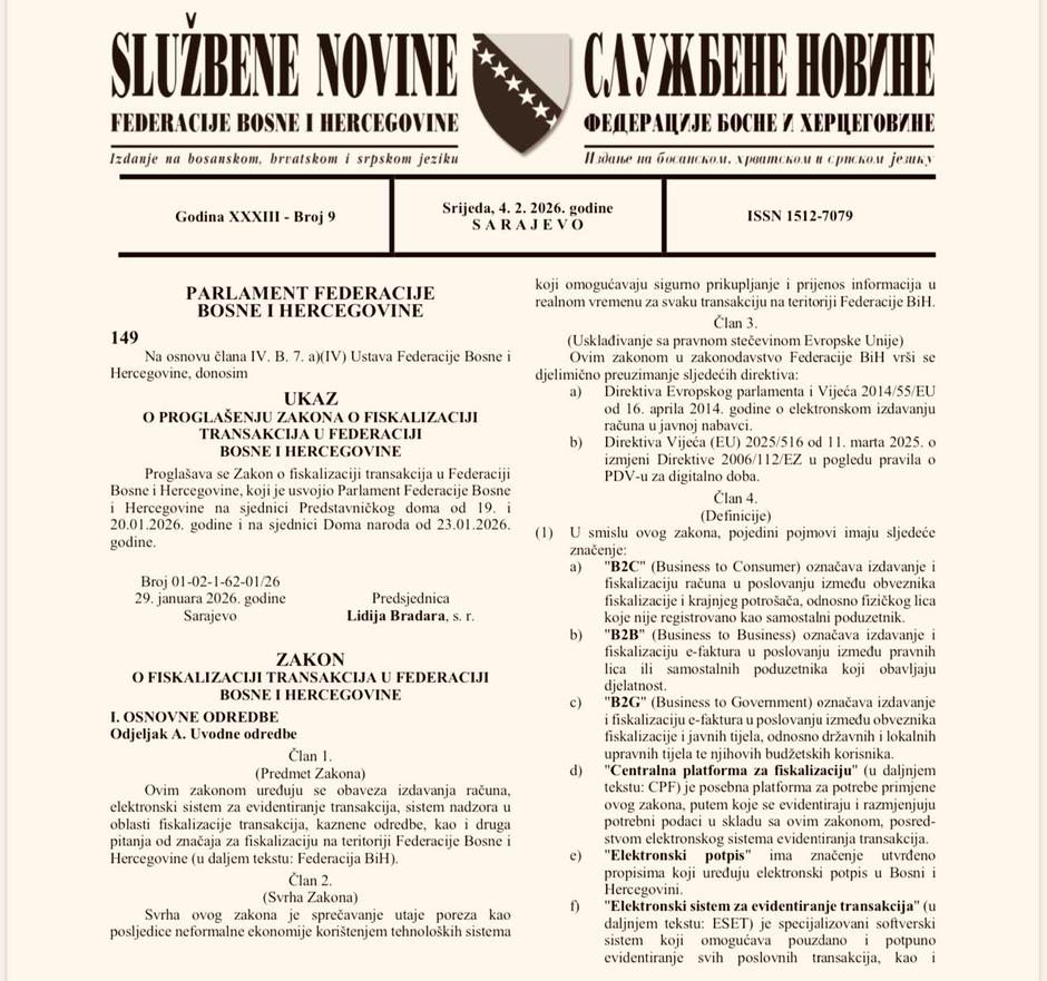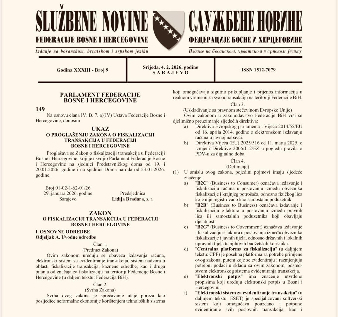 U Službenim novinama FBiH jučer je objavljen Zakon o fiskalizaciji transakcija FBiH.