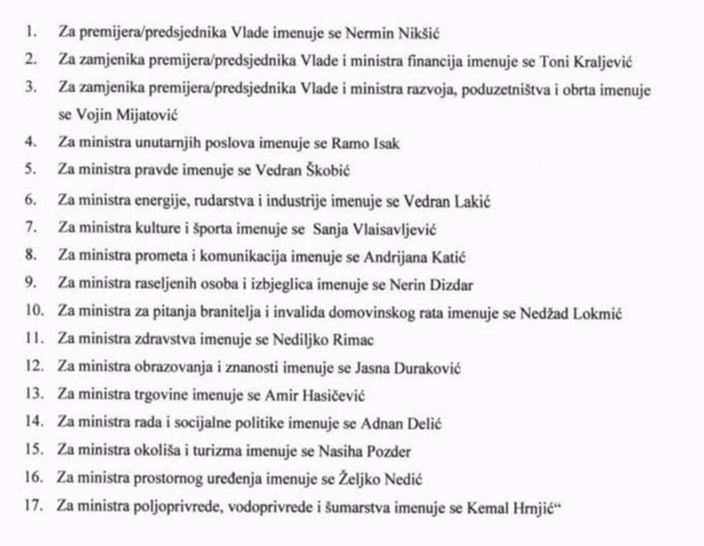 Zastupnici su već sinoć dobili dopis predsjednice Federacije BiH Lidije Bradare o imenima ministara nove Vlade FBiH.