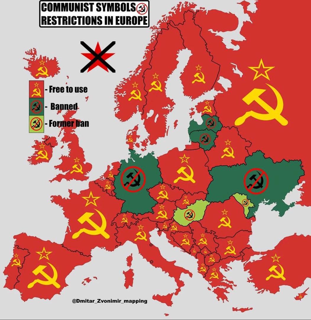 Sudeći prema jednoj mapi objavljenoj na društvenim mrežama, iznenađujuće mali broj europskih zemalja je do sada zabranio uporabu i isticanje komunističkih simbola i znakovlja. Stanje je takvo da je u ogromnoj većini zemalja starog kontinenta, i to u uglavnom onih koje su najizravnije bile najvećim žrtvama komunističkih režima i ideologije, dozvoljena slobodna uporaba i isticanje komunističkih simbola.