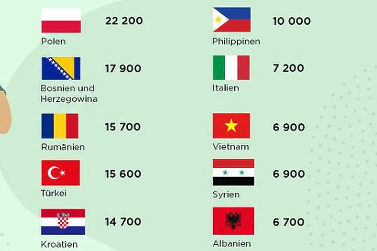 Tako je prema statistici u poslovima skrbi zastupljeno 10.000 Filipinaca, 6.900 Vijetnamaca kao i 6.900 Sirijaca. Među 11 "najzastupljenijih" svoje mjesto su našli i Italijani (7.200) i Albanci (6.700).