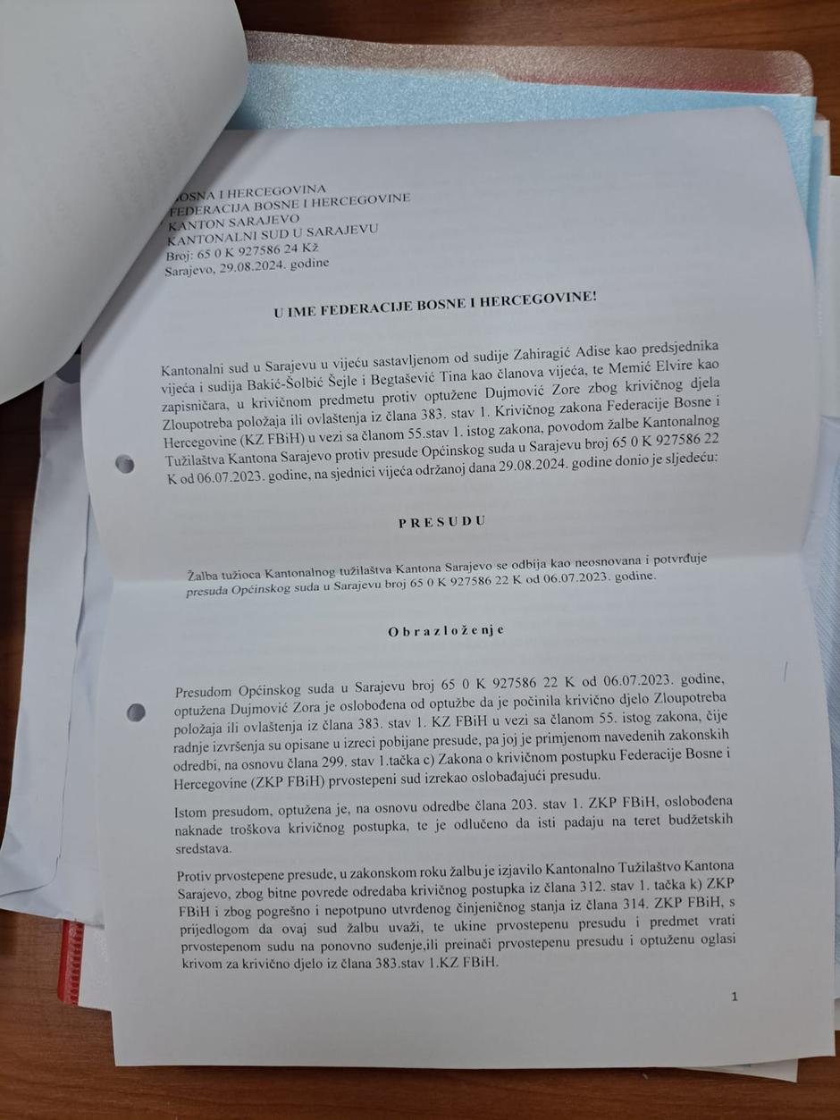Županijski sud u Sarajevu odbacio je optužbe i pravomoćno oslobodio krivnje bivšu ministricu kulture i športa Federacije BiH Zoru Dujmović zbog navodnog nezakonitog zapošljavanja savjetnika. Kako doznaje Večernjak, sudsko vijeće sastavljeno od predsjedateljice Adise Zahiragić, i sudaca Šejle Bakić-Šolbić i Tina Begtaševića, kao članova vijeća donijelo je takvu odluku nakon što se sarajevsko, županijsko tužiteljstvo žalilo na prvostupanjsku presudu o oslobađanju od odgovornosti.